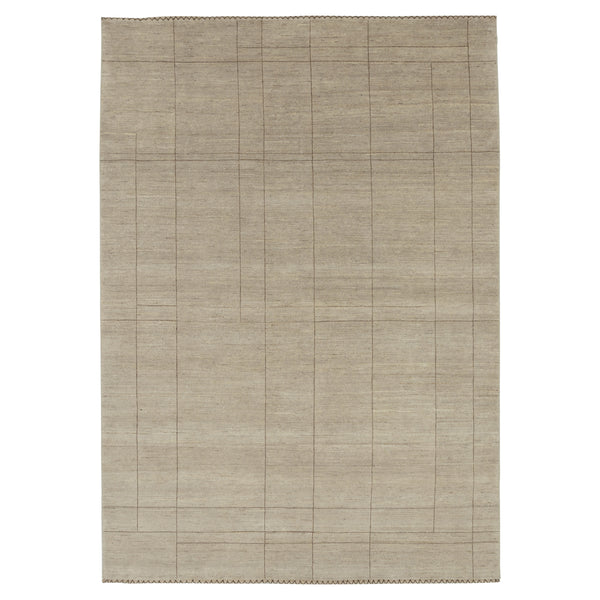 This Brown Contemporary Wool Rug measures 8'2" x 11'6", designed to serve as a central element in various living spaces. It is crafted from wool, a natural fiber valued for its durability, resilience, and soft feel underfoot. The rug features a hand-knotted construction, a traditional method that ensures strength and a unique character for each piece. This detailed craftsmanship originates from India, a region known for its heritage in rug making. The hand-knotted technique contributes to the rug's long-lasting quality...