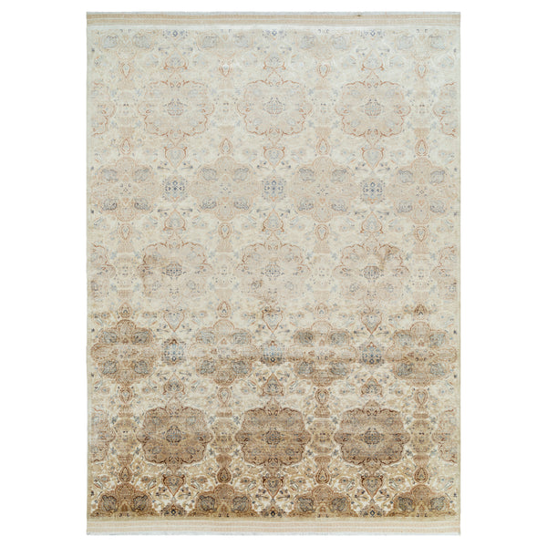 This Brown Contemporary Silk Rug, measuring 10 feet by 14 feet, offers a substantial and refined foundation for larger interior spaces. Hand-knotted in India, this piece reflects traditional craftsmanship applied to a modern design aesthetic. The rug is crafted from 100% natural silk fibers, providing a soft texture and a subtle, natural sheen. Its hand-knotted construction ensures a durable and dense pile, characteristic of high-quality artisanal textiles. The design presents a contemporary style with a faded appearance. The color palette...