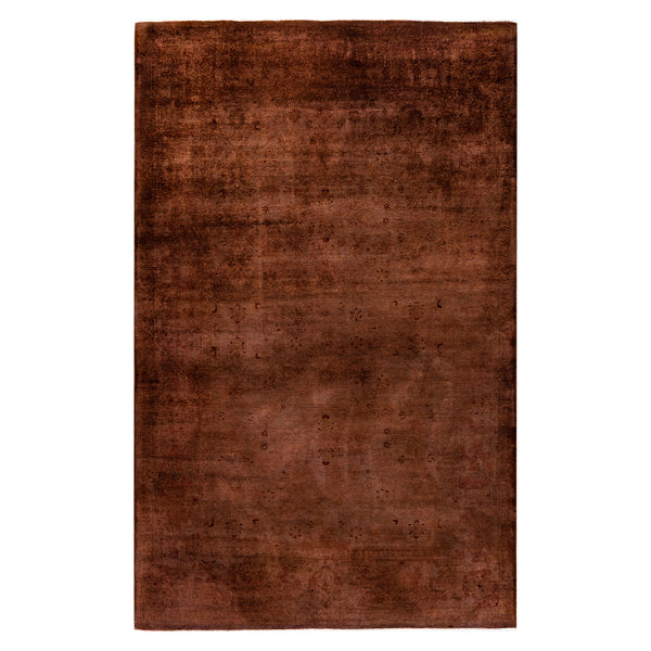 This brown overdyed wool rug measures 5'2" x 8'3". It features a rich, deep brown color, achieved through the overdyed process. This technique involves redyeing a pre-existing rug, which allows its original pattern to subtly emerge from beneath the new solid color. The result is a rug with a distressed, vintage character and unique visual depth. The rug is hand-knotted from durable wool, a construction method that ensures strength and a long lifespan. Each knot is tied by hand, contributing...