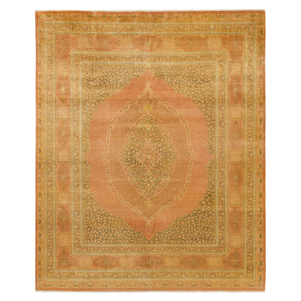 This hand-knotted traditional Mogul rug originates from Pakistan. Crafted entirely from wool, it offers a blend of durability and softness underfoot. Measuring 8 feet 1 inch by 9 feet 10 inches, this area rug is designed for a variety of room sizes. The rug's design showcases a gold color palette, featuring antique peach undertones in the central field and medallion. Intricate floral and vine motifs in olive green and various gold shades fill the field surrounding the large, ornate central...