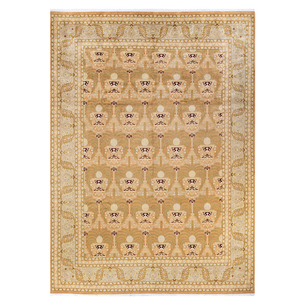 This large hand-knotted wool rug from Pakistan offers a blend of traditional design and durable craftsmanship. Measuring 9'3" by 12'5", this rug is designed to anchor substantial living spaces with its classic aesthetic and quality materials. The rug features a traditional pattern characterized by a central field filled with repeating stylized motifs. These designs, presented in a warm brown color palette with lighter cream and subtle darker accents, are framed by an intricately detailed border. This border incorporates multiple bands...
