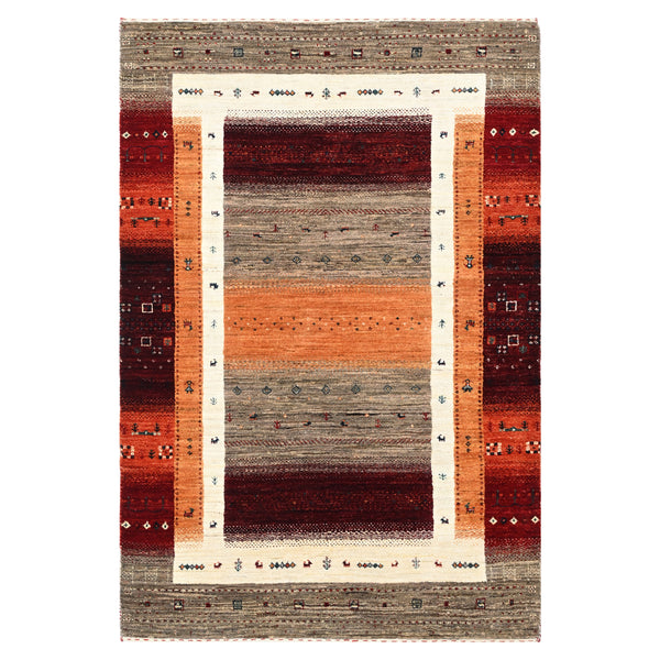 This Brown Traditional Gabbeh Wool Rug offers a blend of classic design and enduring craftsmanship. Hand-knotted in India, this area rug is constructed entirely from wool, known for its resilience and natural texture. It serves as a central piece for various interior settings, providing both comfort and visual interest. The design features a rich palette centered around shades of brown, rust, and orange, accented by cream and grey-brown tones. Its pattern consists of prominent horizontal bands, characteristic of the Gabbeh...