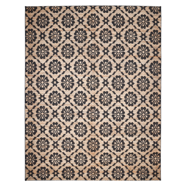 This 2'6" x 8' transitional rug is crafted from a durable jute and cotton blend. It features an earthen brown base with a contrasting dark geometric floral pattern. The runner dimensions make it suitable for narrow or extended spaces. Constructed from 60% jute and 40% cotton, this rug offers a distinct texture and resilient feel. Jute provides a natural, rustic character, while cotton contributes to the rug's overall pliability and comfort. The intricate pattern, a series of repeating dark floral...