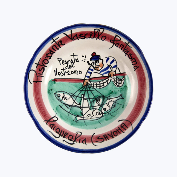 Discover the Buon Ricardo Plate, Ristorante Vascello Fantasma by abcVintage. Infused with Italian coastal charm, this beautiful plate blends a whimsical seaside narrative with a rich palette of primary hues. A gorgeous addition to summer table settings. Style it with any of the Italian restaurant-themed plates in our vintage collection.