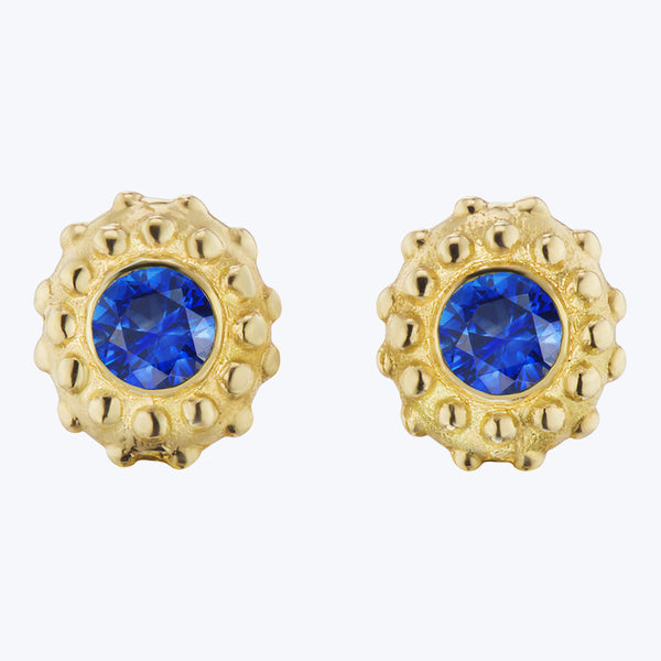Inspired by sea urchins, Ana Katarina’s California Dreaming Blue Sapphire Stud Earrings couple vintage-style texture with a modern, feminine vibe. Incorporate these beauties into an elevated gold-and-gemstone ear stack. Crafted in 18K yellow gold and adorned with blue sapphires. Made in the USA.