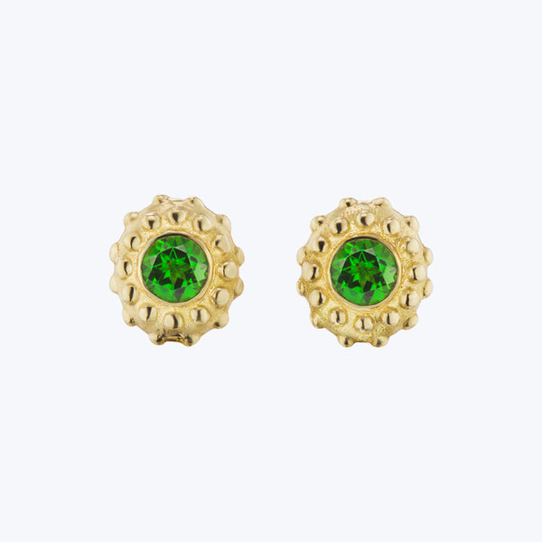 Inspired by sea urchins, Ana Katarina’s California Dreaming Tsavorite Garnet Stud Earrings couple vintage-style texture with a brilliant green hue. Incorporate these beauties into an elevated gold-and-gemstone ear stack. Crafted in 18K yellow gold and adorned with tsavorite garnets. Made in the USA.