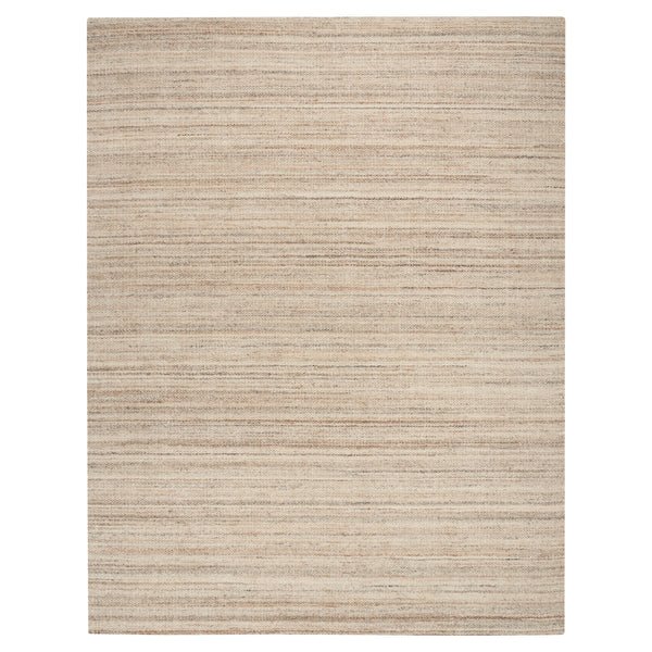 The Ivory Grey Wool Polyester Blend Contemporary Rug from India features a horizontal striped pattern in varying shades of beige and brown. Hand knotted from New Zealand Wool, Polyester, and Rayon, this rug has a tight weave and smooth look, making it a versatile and high-quality addition to any room.