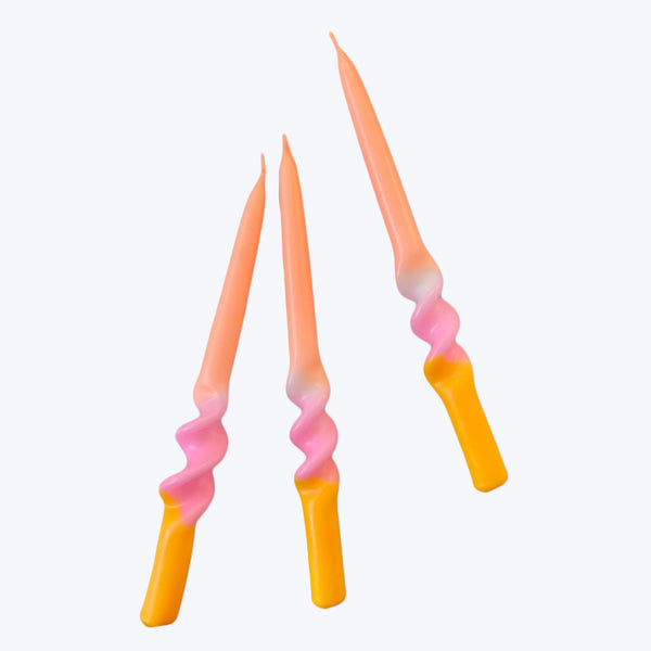 Brighten up your entryway or dinner party table setting with this set of 3 dip-dyed twisted taper candles with darling pink, yellow, and orange colors. Pink Stories Candles are handmade, making each color the same but every pattern special and unique. Dyed in cooperation with social institutions in the beautiful foothills of the Alps. 100% Vegan.