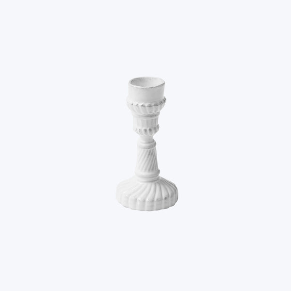 The Peggy candlestick interprets the lines of a scallop seashell for a formal yet beachy aesthetic. Hand molded from black terracotta, each piece is finished in a milky-white glaze that highlights the unique character of the clay, celebrating its imperfections and ensuring that no two pieces are exactly alike. Romantically bohemian, yet practical for everyday use, these pieces are made in an antique Bastille workshop, historically home to Napoleon Bonaparte's own silversmith.