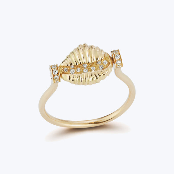 In this 18k yellow gold Capri Spin Ring, the classic coffee bean shell is filled with diamond "sand" and set to rotate between diamond rondelles for an interactive accessory. Renna Jewelry showcases the highest quality pieces for the modern woman — nostalgically chic and eclectically elegant.