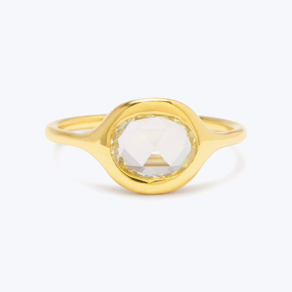 This one-of-a-kind Carved Ring features a stunning oval rose-cut diamond as the focal point of this sculptural statement ring. The 18k yellow gold ring sits softly and comfortably on your finger with a low profile. We love how the modern feel of the carved setting intersects with the vintage feel of the oval rose-cut diamond. 1.02ct rose cut diamond. Dianna Mitchell Fine Jewelry is made in Brooklyn and characterized by clean, modern forms that feel sculptural, yet distinctly feminine. Each...