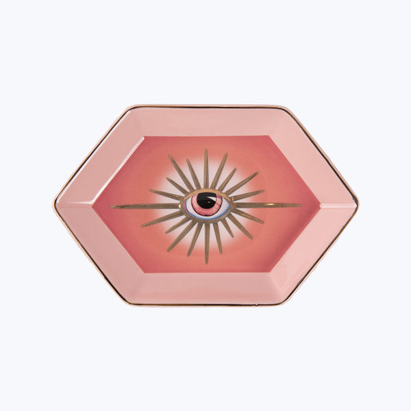Add a mystical touch to your interiors with the Ceramic Evil Eye Trinket Dish by Spitfire Girl. Crafted in ceramic and featuring a gold-trimmed evil eye, this mesmerizing trinket dish is a beautiful blend of artistry and spiritual significance. Believed to hold protective powers, the evil eye will ward off negative energies and watch over your treasures. Made in the USA. Available in Blue and Pink.