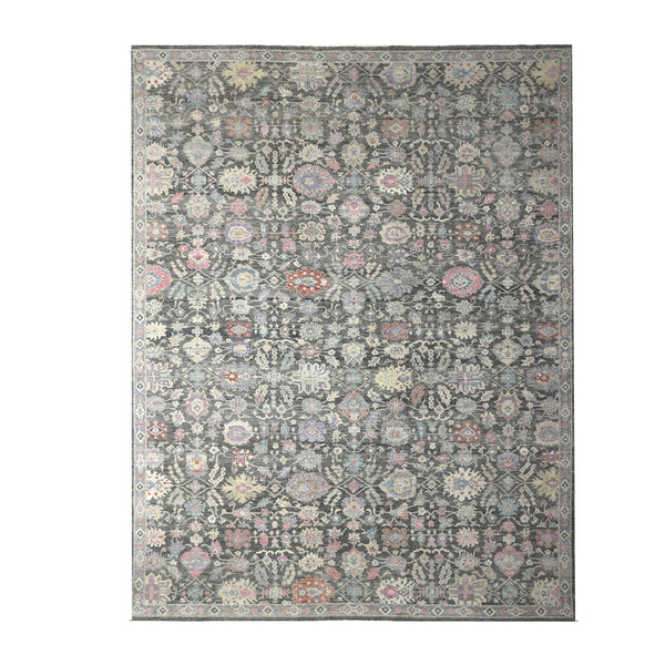 This Charcoal Traditional Wool Rug from India is a hand-knotted masterpiece. Featuring a muted color scheme of gray, blue, pink, and hints of red and yellow, this intricate traditional rug boasts a symmetrical, elaborate pattern with floral and geometric motifs. The detailed border frames the central design beautifully, adding warmth and character to any room. Crafted from high-quality wool, this exquisite rug is perfect for adding a touch of elegance to your home.