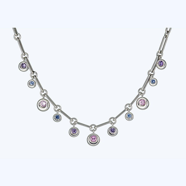 The Chaumet Sapphire Fringe Necklace features a silver-toned chain with circular pendants in purple and blue sapphires. This contemporary piece is crafted from 18K white gold and exudes elegance and sophistication. This necklace is a must-have for formal occasions.