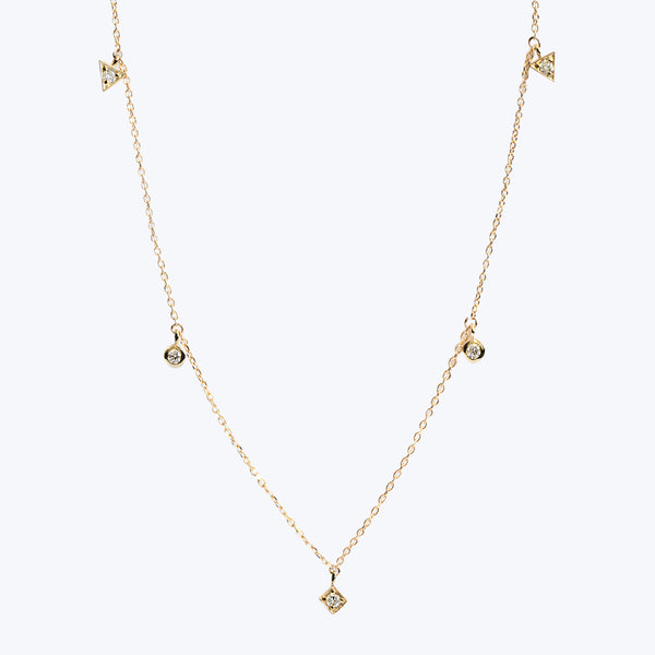 Encrusted in various geometric shapes, five gemstones dangle delicately from a gold chain. This dainty & Art-Deco inspired necklace is perfect to layer and wear every day.Shapes measure 3mm/ 1/8'' wide. Necklace fastens with a lobster clasp & has a 28mm/ 1'' adjustment. From its inception, Anzie Jewelry has been a celebration of life and color. Named after its founder, Anzie Stein, this collection of fine jewelry is best known for its signature pieces using precious gemstones that bring luxury...