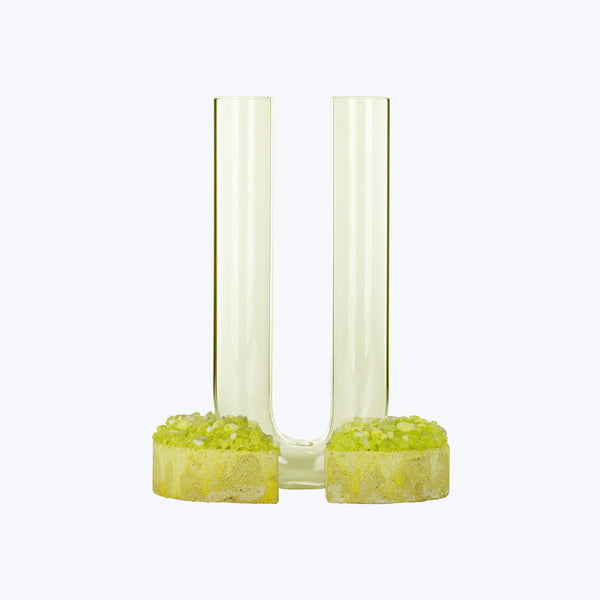 Yellow-painted glass and sustainable Italian natural stone combine to create a mystical merging of raw and polished materials. The Cochleae Vases Collection is inspired by the life cycle of snails and captures their growth in which the invertebrate body (the curved glass) rises free towards the sky, embraced on the sides by the calcarenite shell. These historical stones are recovered and reprocessed following a sustainable product cycle and then treated with an ecological substance developed by COKI.