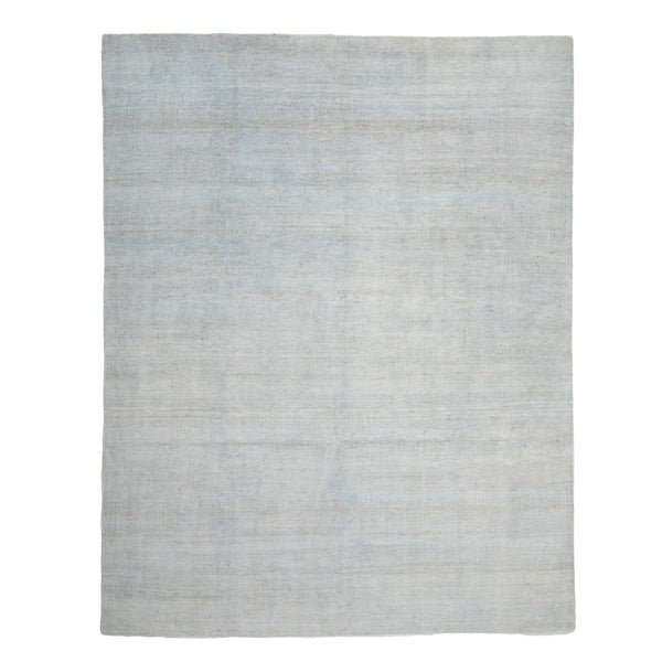 This Light Blue Solid Art Silk Rug is a luxurious addition to any home. Hand-knotted in India, this 7'10" x 9'11" rug features a subtle texture and minimalistic design in a pale blue, gray, or off-white shade. The straight edges and high-quality art silk material give this solid rug a timeless elegance that will complement any interior style.