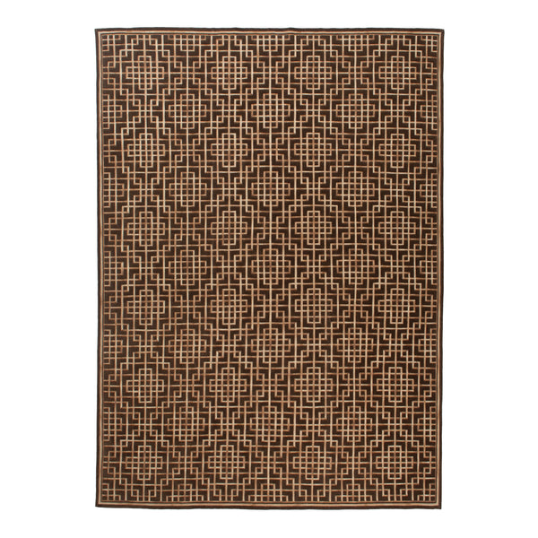 A 10-foot by 13-foot 10-inch brown rug—an expanse of modern glamour with its refined and rich hues. The intricate geometric pattern, a charismatic interplay of squares and lines, speaks with a voice both modern and ancient, capturing the spirit of Tibetan weaving. It's a visual symphony that enriches spaces, inviting warmth and texture with its structured elegance. Crafted by the skilled hands of Nepali artisans, this rug is more than decoration; it's a testament to meticulous craftsmanship. Each knot, a...
