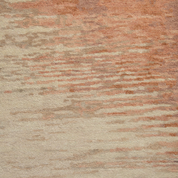 The Orange Contemporary Wool Silk Blend - 2' x 3' Sample rug from Nepal is a visual masterpiece. Its abstract design features a transition of darker brownish tones to lighter shades of beige, creating a modern, watercolor-like appearance. The horizontal bands and streaks add a visually textured effect, showcasing the rug's exquisite craftsmanship. Hand-knotted with a blend of wool and silk, this high-end rug not only boasts a stunning design but also guarantees superior quality and durability.