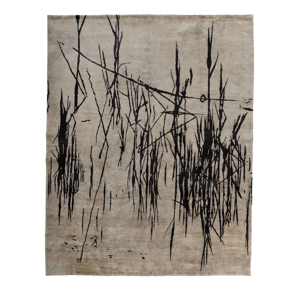 The Silver Aurora Tibetan Contemporary Rug measures 8 by 10 feet, providing a substantial floor covering for various spaces. This hand-knotted piece features a wool and silk blend in a contemporary design. Its silver background is overlaid with a striking abstract pattern of dark, organic forms, reminiscent of reeds or tall grasses, creating a visual depth that grounds the overall design. Crafted in Nepal, this rug utilizes traditional Tibetan hand-knotting techniques, ensuring durable construction. The blend of wool and silk...