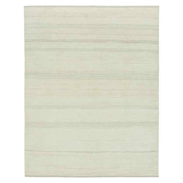 This Cream Textured Wool rug, measuring 8' x 10', is a sophisticated piece from India. Hand-knotted with wool, it features a simple yet stunning design of horizontal stripes in shades of light grey and beige. The subtle texture adds depth and quality to this minimalistic and contemporary area rug.