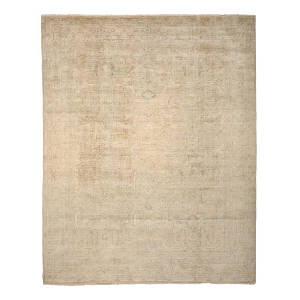 This Cream Antique Revival Silk Rug - 8' x 10' is a handmade masterpiece from India. This elegant piece features a subtle beige and tan color palette with a delicate floral or geometric pattern. The silk material gives it a luxurious texture, while the hand-knotted construction ensures top-notch quality. Perfect for adding a touch of vintage charm to any space.