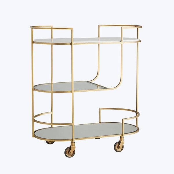 Taking cues from art deco design, the Curved Brass Bar Cart from abc carpet & home's Arteriors Collection is here to add a touch of glamour to your home. Made with an iron frame in an antique brass finish, this capsule-shaped bar cart offers a contemporary twist on timeless design making it a standout addition to any classic or modern home. Each tier of the bar cart boasts a distinct design element, creating a captivating visual effect that is both...