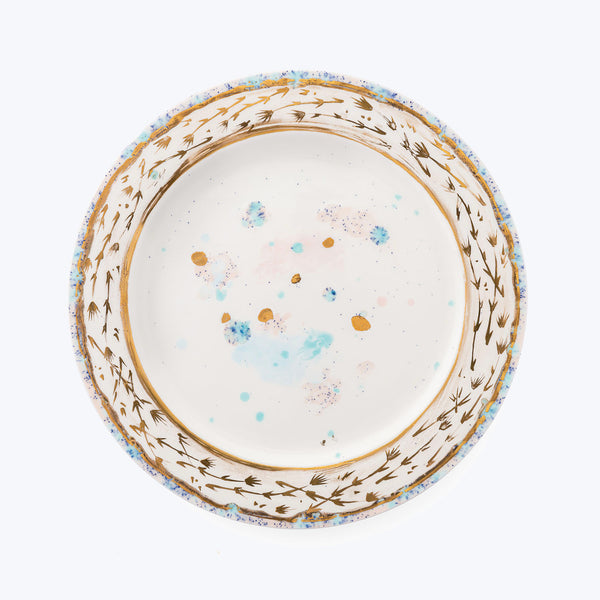 Exquisitely one-of-a-kind, the Dafne Rim Charger Plate is surrounded by a gold rim of stylized flowers and a white center with subtle sprinkles of light blue, pink, black, and golden dots. Unique, elegant, and whimsical, the Dafne Porcelain Dinnerware Collection creates a golden garden on your table. Originating from Italy, Coralla Maiuri is a world-renowned artist who creates hand-crafted dinnerware and home decor inspired by natural elements.