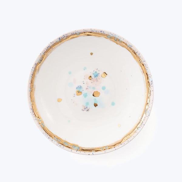 Exquisitely one-of-a-kind, the Dafne Soup Coupe Plate is surrounded by a gold rim and a white center with subtle sprinkles of light blue, pink, black, and golden dots. Unique, elegant, and whimsical, the Dafne Porcelain Dinnerware Collection creates a golden garden on your table. Originating from Italy, Coralla Maiuri is a world-renowned artist who creates hand-crafted dinnerware and home decor inspired by natural elements.