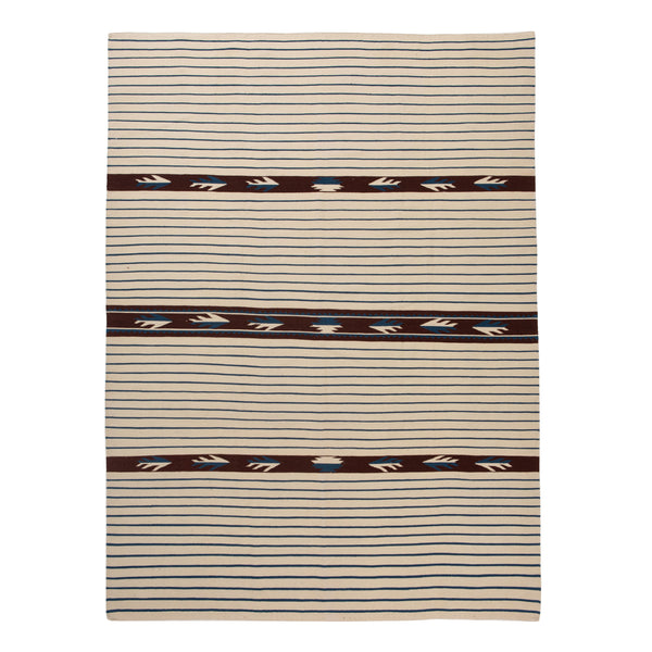 This piece is not merely an area rug; it’s an affirmation of craftsmanship and culture. An 8'4" by 11'6" canvas of hand-knotted wool pulses with a quiet dignity, meticulously crafted in the heart of Nepal. The artistry of this rug whispers through a soft ivory backdrop, severed by the rhythm of thin, dark blue stripes. It is a layout of elegant restraint, punctuated by three rich, dark brown bands that traverse its width with deliberate precision. Within these boundaries, geometric...