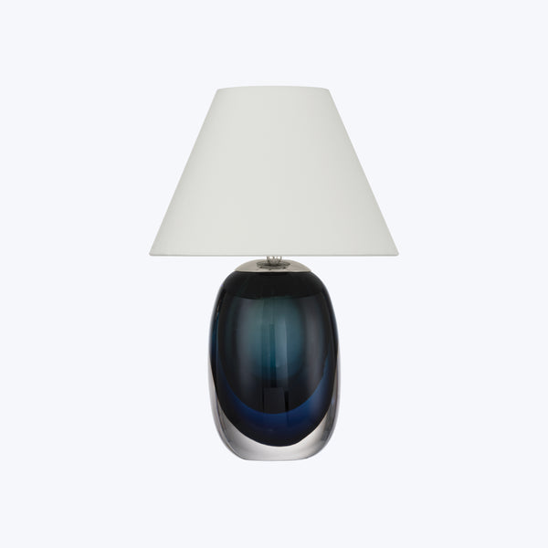 The Danza Blue Cordless Table Lamp is crafted from clear, amber, and blue mouth-blown art glass, its layered colors and organic form reflecting the influence of Mid-Century Scandinavian design. With a bold 1950s-60s aesthetic, the lamp is topped with a white hardback shade and fitted with a rechargeable bulb, combining vintage-inspired style with modern convenience. The fixture is dimmable.