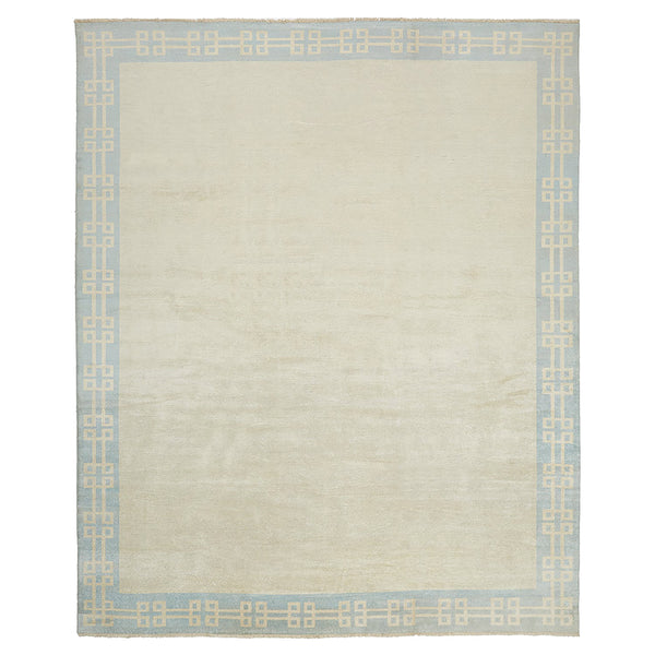 A neutral foundation is edged with a simple traditional design in soft blue, finished with a subtle fringe.
