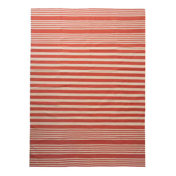 Bold and unapologetic, the red flatweave cotton rug stands as a testament to the power of design. Measuring 8 feet 1 inch by 11 feet 1 inch, its size commands attention, turning any room into a coherent statement of style and function. It's not just a rug—it's an anchor, tying together disparate elements of a living room, dining area, or spacious bedroom with ease. This isn't just any red; it's a statement. A crisp, off-white pattern of stripes cuts through...
