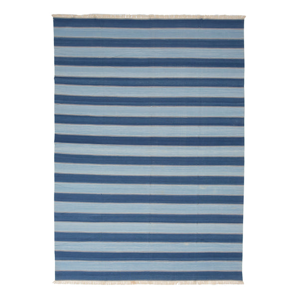 This Blue Striped Dhurrie Wool Rug - 10' x 14' is a flatweave wonder made to adorn your floors with a balanced tripe stripe design. Handwoven in India, this flatweave rug is a durable addition to your home with its low pile and reversible capabilities. Our unique rugs are sustainably sourced from around the globe. Finished with a traditional textured fringe.