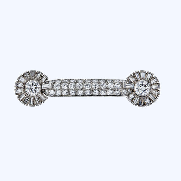 Introducing the Diamond Bar Brooch Earrings - a stunning piece of Art Deco jewelry. These earrings feature a shimmering pattern of smaller diamonds arranged closely together, with larger diamonds at each end surrounded by baguette-cut diamonds. Made from precious metal, this elegant design exudes luxury and opulence. A true statement of sophistication with 2.5 ct. diamonds.