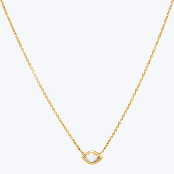 A crisp and sparkling marquise rose cut 0.3ct diamond set in warm 18k gold hangs on a 16" chain.