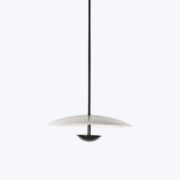 A black iron frame suspends in mid-air a sleek disk, offering up a disk pendant light with a sharp silhouette. A minimalist’s choice for those seeking a distinctly modern abode. Brass Finish is also available.