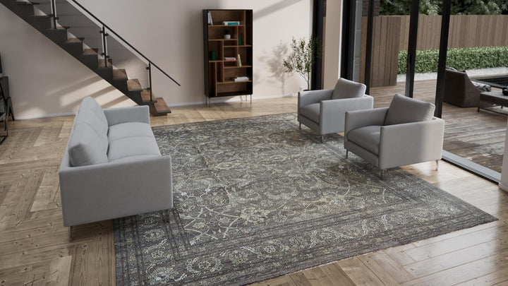 From the skilled hands of Pakistani artisans, each knot tells a story of dedication and precision, celebrating traditional craftsmanship. The intricate, faded design is a dialogue between classic motifs and modern sensibilities, with a distressed finish that nods subtly to the past. A dominant, layered grey palette whispers depth, its muted tones engaging in a quiet dance with lighter accents that lend texture without overshadowing the rug's serene essence.