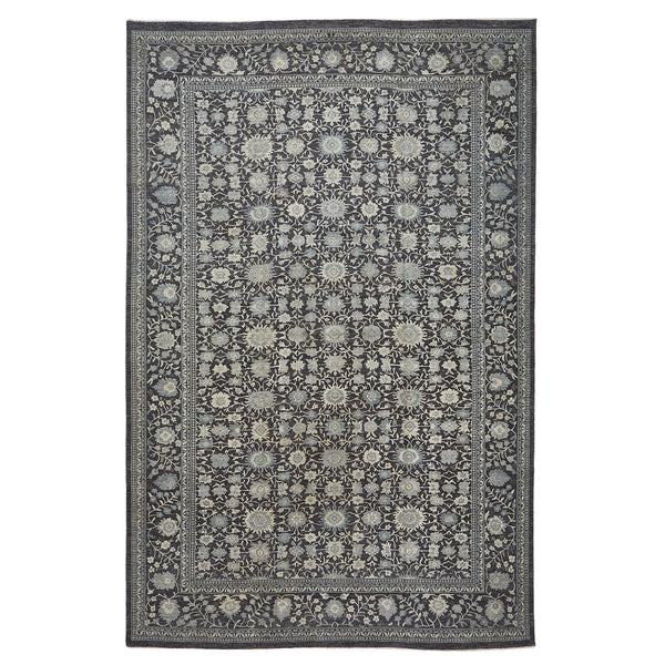 This oversized rug is featured in a collection of over forty distressed rugs that permutate vintage styles into a variety of muted color palettes. Each oversized rug is transformed by skilled artisans in Pakistan through cycles of washing, sunning, and shearing - making modern iconic motifs from Turkish and Persian rug designs. Perfect for a large, sun-drenched room. Hand-knotted from wool.