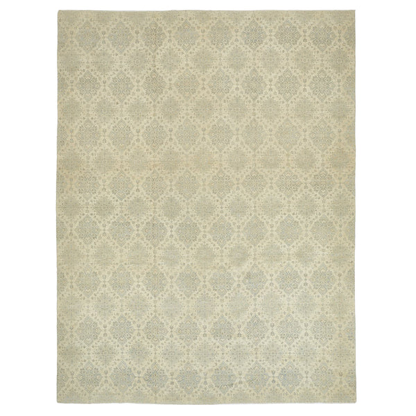 This oversized rug is featured in a collection of over forty distressed rugs that permutate vintage styles into a variety of muted color palettes. Each oversized rug is transformed by skilled artisans in Pakistan through cycles of washing, sunning, and shearing - making modern iconic motifs from Turkish and Persian rug designs. Perfect for a large, sun-drenched room. Hand-knotted from wool.