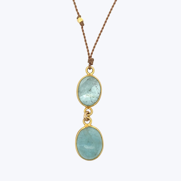 Discover the Double Aquamarine Kingfisher Necklace by Margaret Solow. Featuring aquamarine ovals framed in 18K gold, this refined necklace boasts an elegant drop silhouette, perfect for V-neck tops and dresses. An elevated piece for understated bohemian jewelry lovers. Crafted in the USA with a 14K gold clasp.