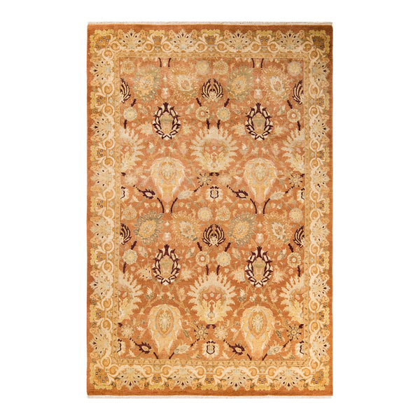 An Orange Traditional Wool Rug measuring 6'2" x 9'5" shimmers with a timeless elegance, crafted by the dexterous hands of Pakistani artisans. It is an homage to an enduring textile legacy. Woven from 100% natural wool, the piece promises remarkable durability and comfort, laying a plush foundation with its reassuring heft of 41.0 lb. The rug boasts a vibrant burnt orange field, alive with an intricate dance of traditional floral motifs and a commanding central medallion. This sophisticated design unfolds...