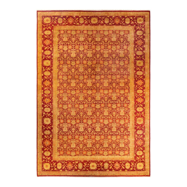 This rug is more than just a floor covering; it's a bold statement. Crafted by skilled artisans in Pakistan, it channels a rich palette of deep crimson red and luminous gold, casting a warmth that seems to whisper tales of timeless beauty. The central field is a masterpiece of intricacy, with stylized floral and vine motifs weaving through your imagination like a lyrical dance of classic elegance. The multi-layered border encases this central narrative with medallions and botanical shapes, each...