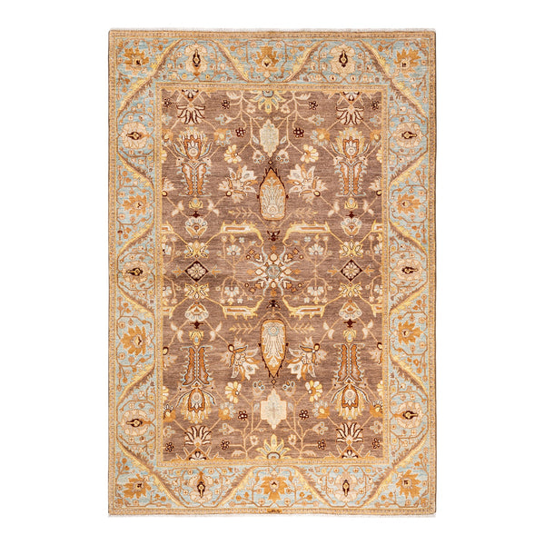 This Brown Traditional Wool Rug, with its dimensions of 6'3" by 8'10", stands as a testament to timeless elegance. It's an embodiment of understated luxury, crafted with meticulous care from high-quality wool. The rug's earthy brown backdrop invites you in, exuding warmth while allowing its intricate patterns to shine. Delicate botanical and floral motifs weave their way through a palette of cream, muted gold, and whispers of light blue, creating an artwork that feels like an echo from a bygone...