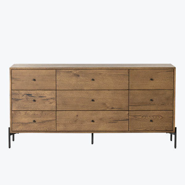 Discover the Eaton 9-Drawer Dresser by Four Hands. Merging modern practicality and mid-century style, this beautiful dresser offers a warm aesthetic and generous storage. The Eaton 9-Drawer Dresser is crafted in amber oak veneer and detailed with gunmetal iron knobs and coordinating legs. Designed with soft-close drawers.