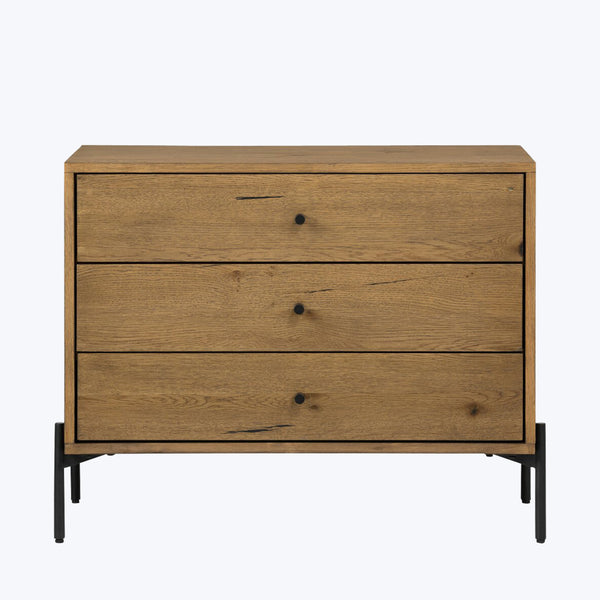 Clean and streamlined, the Eaton Large Nightstand brings timeless cool to the bedroom. This contemporary piece is crafted in thick oak veneer and detailed with edgy, gunmetal-finished hardware. A warm accent for industrial spaces. Available in Amber Oak Resin and Light Oak Resin editions.