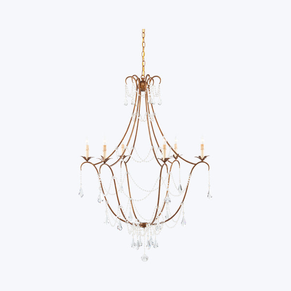 Bring old-world elegance to your interiors with the Elizabeth Gold Chandelier by Currey & Company. Crafted in Rhine gold-finished wrought iron, this stunning chandelier is adorned with beaded crystal strands and tasteful crystal teardrops. The Elizabeth’s airy frame brings a modern feel to its traditional form. A perfect addition to vintage and antique-furnished spaces. Adjustable from 57" to 124" with use of included chain/rod kit/cable.
