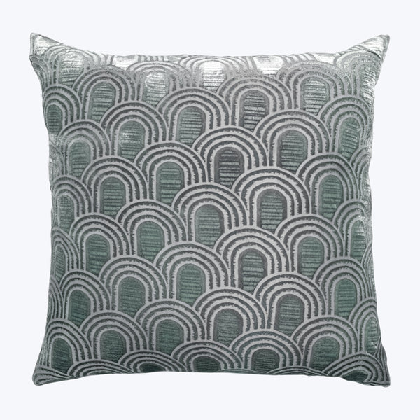 Elevate your interiors with the Endless Velvet Pillow Jade by Kevin O’Brien Studio. Handcrafted in a beautiful silk blend, this stunning pillow features a deco-inspired design of interlocking arches. An exquisite addition to luxe, retro-influenced spaces. Made in Philadelphia by expert textile artisans. Style with the Endless Velvet Pillow Opal or the Endless Velvet Pillow Moonstone.