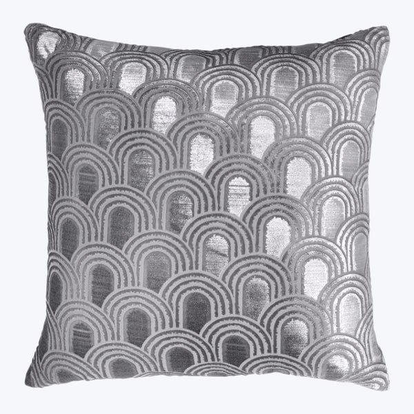 Elevate your interiors with the Endless Velvet Pillow Silver by Kevin O’Brien Studio. Handcrafted in a beautiful silk blend, this stunning pillow features a deco-inspired design of interlocking arches. An exquisite addition to luxe, retro-influenced spaces. Made in Philadelphia by expert textile artisans.