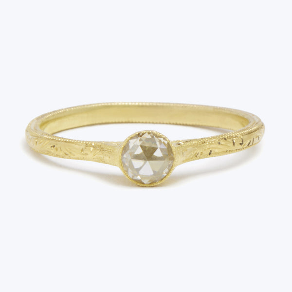This Engraved Cathedral Ring features a round rose-cut diamond set in a carved gold setting. The entire statement ring is completely hand-engraved with milgrain detail for an intricate border. This one-of-a-kind diamond ring encompasses the perfect harmonious blend of modern and vintage. 0.16ct champagne rose cut diamond. Dianna Mitchell Fine Jewelry is made in Brooklyn and characterized by clean, modern forms that feel sculptural, yet distinctly feminine. Each diamond is hand-picked and set in a solid gold cast made specifically...
